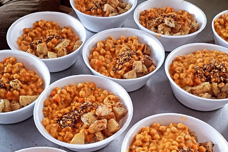 A Cozinha Ajeum Vital, da empreendedora local Prince Oliveira, se prepara para oferecer aos moradores do Morro da Mariquinha um delicioso risoto de frango. Um dos tantos projetos nascentes dentro da favela que foram impulsionados pelo empreendedorismo local, a Ajeum Vital trabalha especialmente com pratos da culinária Afro-Artesanal Ancestral.